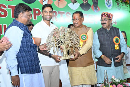 अंतर्राष्ट्रीय टी-20 के भारतीय कप्तान सूर्य कुमार यादव ने जय जोहर के उद्बोधन से अपनी बात रखी. उन्होंने छत्तीसगढ़ में वनों के संरक्षण के लिए किए जा रहे प्रयासों की सराहना की और कहा कि छत्तीसगढ़ में चारों ओर हरियाली है. उन्होंने कहा कि खिलाड़ियों के कैरियर में अनुशासन महत्वपूर्ण है. उन्होंने आने वाली पीढ़ी के लिए वनों को हराभरा रखने और खेल को बढ़ावा देने के लिए राज्य सरकार की सराहना करते हुए इस आयोजन के लिए बधाई दी.