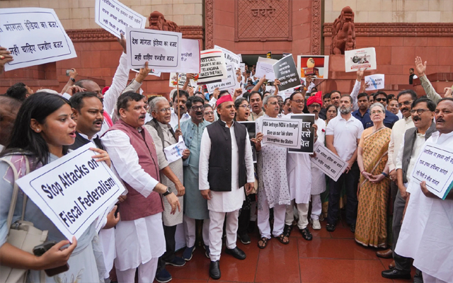 नयी दिल्ली: कांग्रेस और केरल के मुख्य विपक्षी गठबंधन यूडीएफ के कुछ अन्य घटक दलों के सांसदों ने केंद्रीय बजट में उपेक्षा का आरोप लगाते हुए सोमवार को संसद परिसर में प्रदर्शन किया। संसद के मकर द्वार के निकट इन सांसदों ने केंद्र सरकार के खिलाफ नारेबाजी की। उन्होंने केंद्रीय बजट को ‘केरल विरोधी’ करार दिया।