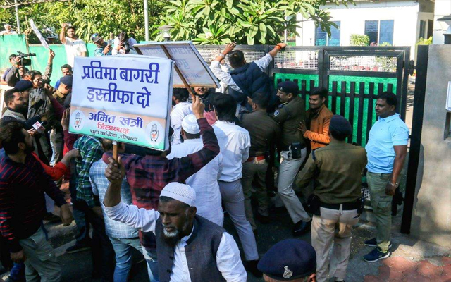 भोपाल: मध्यप्रदेश की नगरीय विकास एवं आवास राज्यमंत्री प्रतिमा बागरी के इस्तीफे की मांग को लेकर कांग्रेस नेताओं ने बुधवार को उनके सरकारी आवास के बाहर प्रदर्शन किया और बाहर लिखे नाम पट्ट पर कालिख पोत दी।