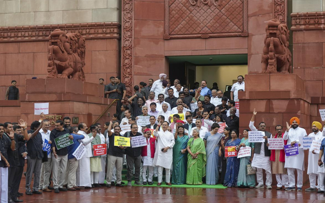 नयी दिल्ली: विपक्षी गठबंधन ‘इंडिया’ (इंडियन नेशनल डेवलपमेंटल इन्क्लूसिव अलायंस) के घटक दलों के सांसदों ने शीतकालीन सत्र के दौरान चुनाव सुधारों के विषय पर चर्चा की मांग और विशेष गहन पुनरीक्षण (एसआईआर) का विरोध करते हुए मंगलवार को संसद परिसर में प्रदर्शन किया।