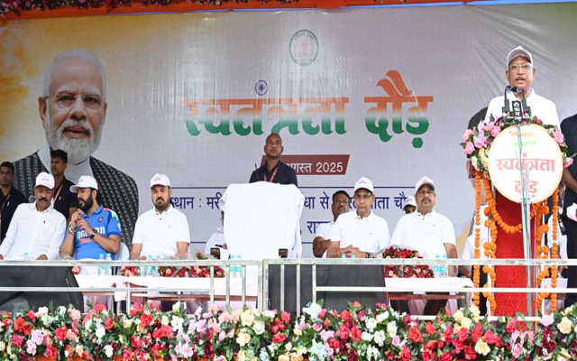 रायपुर: हमारा तिरंगा पूर्वजों के वर्षों के संघर्षों और बलिदान का जीवंत प्रतीक है। हम सभी तिरंगे की शान को हमेशा बनाए रखेंगे, अपने अमर बलिदानियों को कभी नहीं भूलेंगे और सभी मिलकर विकसित, समृद्ध और सशक्त छत्तीसगढ़ का निर्माण करेंगे। मुख्यमंत्री विष्णु देव साय आज राजधानी रायपुर के मरीन ड्राइव में आयोजित स्वतंत्रता दौड़ में शामिल हुए और कार्यक्रम को संबोधित किया। इस दौरान उन्होंने हजारों युवाओं के साथ स्वतंत्रता दौड़ लगाई और भारत माता और अमर बलिदानी रानी दुर्गावती की प्रतिमा पर माल्यार्पण कर उन्हें नमन किया।