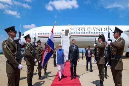 विदेश मंत्रालय के प्रवक्ता रणधीर जायसवाल ने ‘एक्स’ पर कहा, ”भारत-क्रोएशिया संबंधों में ऐतिहासिक मील का पत्थर. प्रधानमंत्री नरेन्द्र मोदी क्रोएशिया के जगरेब पहुंचे. यह किसी भारतीय प्रधानमंत्री की क्रोएशिया की पहली यात्रा है. विशेष सम्मान के तौर पर प्रधानमंत्री आंद्रेज प्लेंकोविक ने हवाई अड्डे पर उनका औपचारिक स्वागत किया.” होटल पहुंचने पर मोदी का स्वागत भारतीय समुदाय के सदस्यों ने किया, जो ‘वंदे मातरम’ और ‘भारत माता की जय’ जैसे नारे लगा रहे थे. प्रधानमंत्री के स्वागत में पारंपरिक भारतीय परिधानों में नृत्य प्रदर्शन भी किया गया.