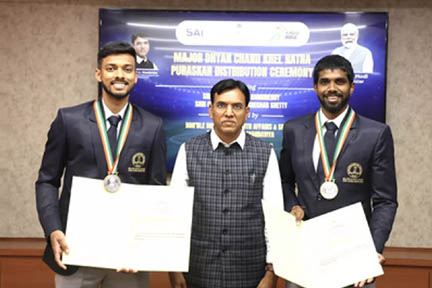 नयी दिल्ली. खेलमंत्री मनसुख मांडविया ने बैडमिंटन सितारे सात्विक साइराज रंकीरेड्डी और चिराग शेट्टी को बृहस्पतिवार को मेजर ध्यानचंद खेलरत्न पुरस्कार प्रदान किया . इस जोड़ी को मानना है कि उन्हें इससे मौजूदा ‘मुश्किल चरण’ से बाहर निकलने में मदद मिलेगी जो फिटनेस समस्यों के कारण और बदतर हो गया है. सात्विक और चिराग को पिछले साल यह सम्मान मिला था लेकिन खेल में व्यस्त होने के कारण वे राष्ट्रपति भवन में सम्मान लेने नहीं जा सके . उन्हें फरवरी में खेलमंत्री से सम्मान लेना था लेकिन सात्विक के पिता आर कासी विश्वनाथम का दिल का दौरा पड़ने से निधन होने के कारण उसे स्थगित करना पड़ा .
