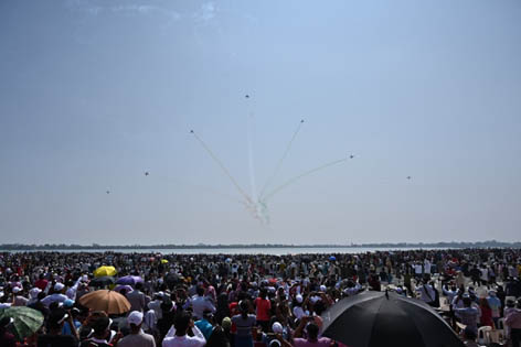 एयर शो में “सूर्यकिरण” की टीम के नौ हॉक-मार्क-123 फाइटर विमानों ने आसमान में हार्ट, डायमंड, लूप, ग्रोवर, डान लाइट, कॉम्बैट तेजस जैसे शानदार फार्मेशन बनाकर लोगों को रोमांचित किया. नीले आसमान में उड़ते लाल-सफेद जेट विमानों द्वारा तिरंगे की आकर्षक ट्रेल छोड़ने पर सेंध जलाशय परिसर तालियों और जय-हिंद के नारों से गूंज उठा. हज़ारों की संख्या में मौजूद नागरिक, युवा और बच्चे लगातार विमानों की कलाबाजियों को अपने कैमरों और मोबाइलों में कैद करते रहे.