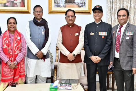 रायपुर. मुख्यमंत्री विष्णु देव साय से आज राजधानी रायपुर स्थित मुख्यमंत्री निवास कार्यालय में छत्तीसगढ़ राज्य सैनिक कल्याण बोर्ड के सचिव ब्रिगेडियर विवेक शर्मा ने सौजन्य भेंट की. इस अवसर पर उन्होंने मुख्यमंत्री साय को सशस्त्र सेना झंडा दिवस के प्रतीक स्वरूप सम्मान बैज लगाया तथा संचालनालय सैनिक कल्याण द्वारा संचालित विभिन्न कल्याणकारी गतिविधियों एवं योजनाओं की विस्तृत जानकारी प्रदान की.