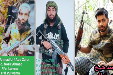 उन्होंने बताया कि तलाश अभियान के दौरान छिपे हुए आतंकवादियों ने सुरक्षाबलों पर गोलीबारी कर दी, जिसके बाद मुठभेड़ शुरू हो गई. अधिकारियों ने बताया कि गोलीबारी में तीन आतंकवादी मारे गए. सेना की चिनार कोर ने सोशल मीडिया मंच ‘एक्स’ पर जारी पोस्ट में कहा, ” मारे गए आतंकवादियों की पहचान आसिफ अहमद शेख, आमिर नजीर वानी और यावर अहमद भट के रूप में हुई है, जिनके पास से एके श्रृखंला की तीन राइफल, बारह मैगजीन, तीन ग्रेनेड और लड़ाई में इस्तेमाल होने वाली अन्य सामग्री बरामद की गई है.” पुलिस सूत्रों ने बताया कि आतंकवादी प्रतिबंधित जैश-ए-मोहम्मद से संबंधित थे.